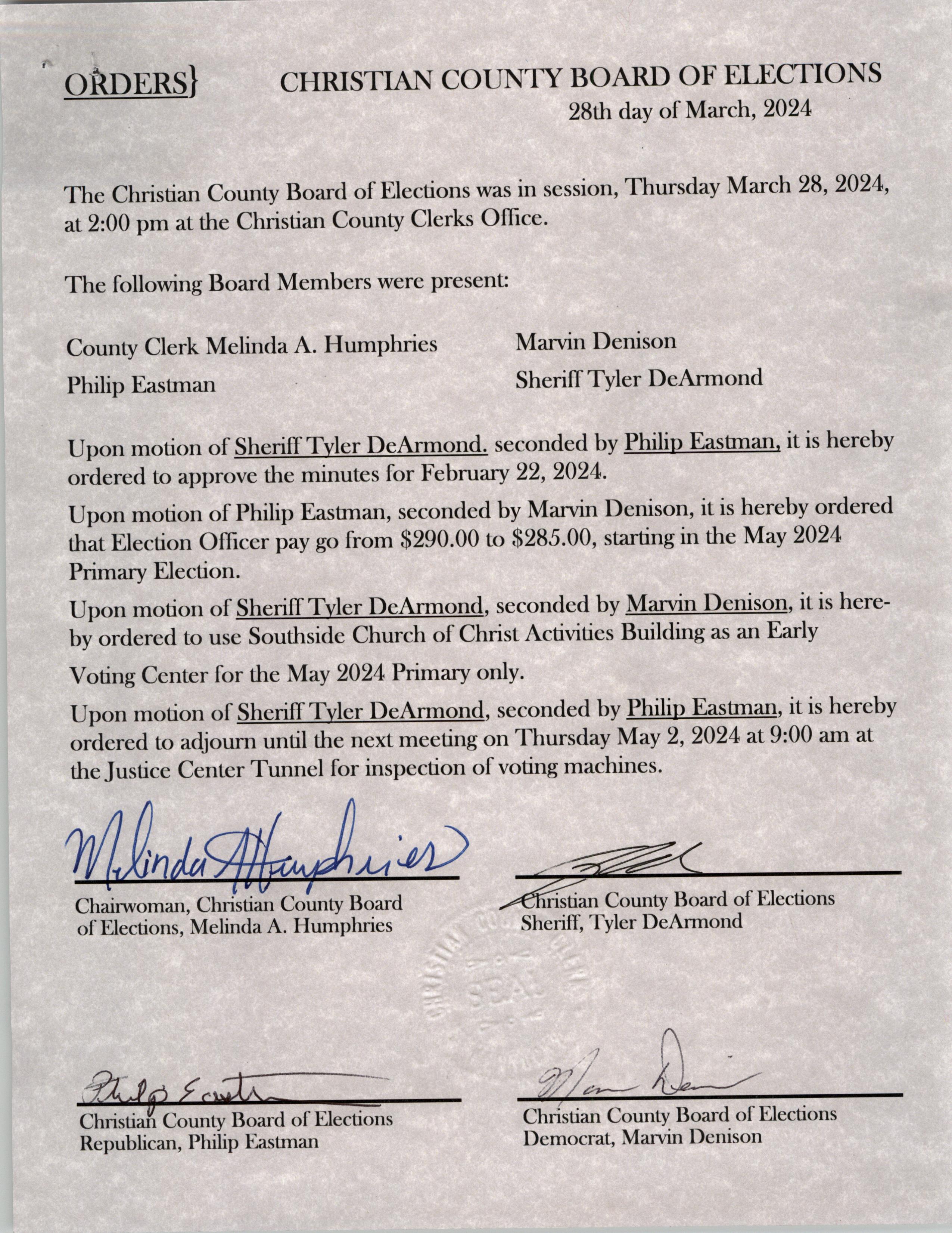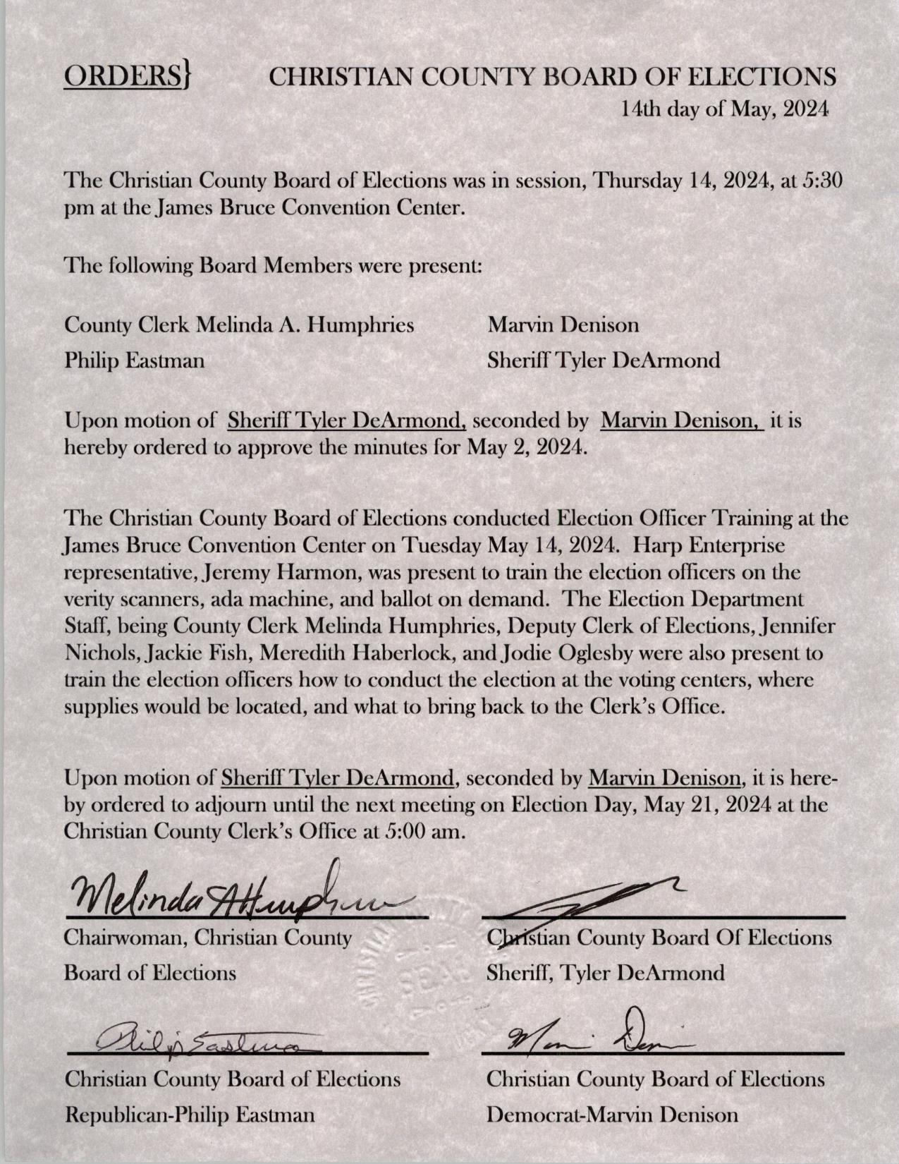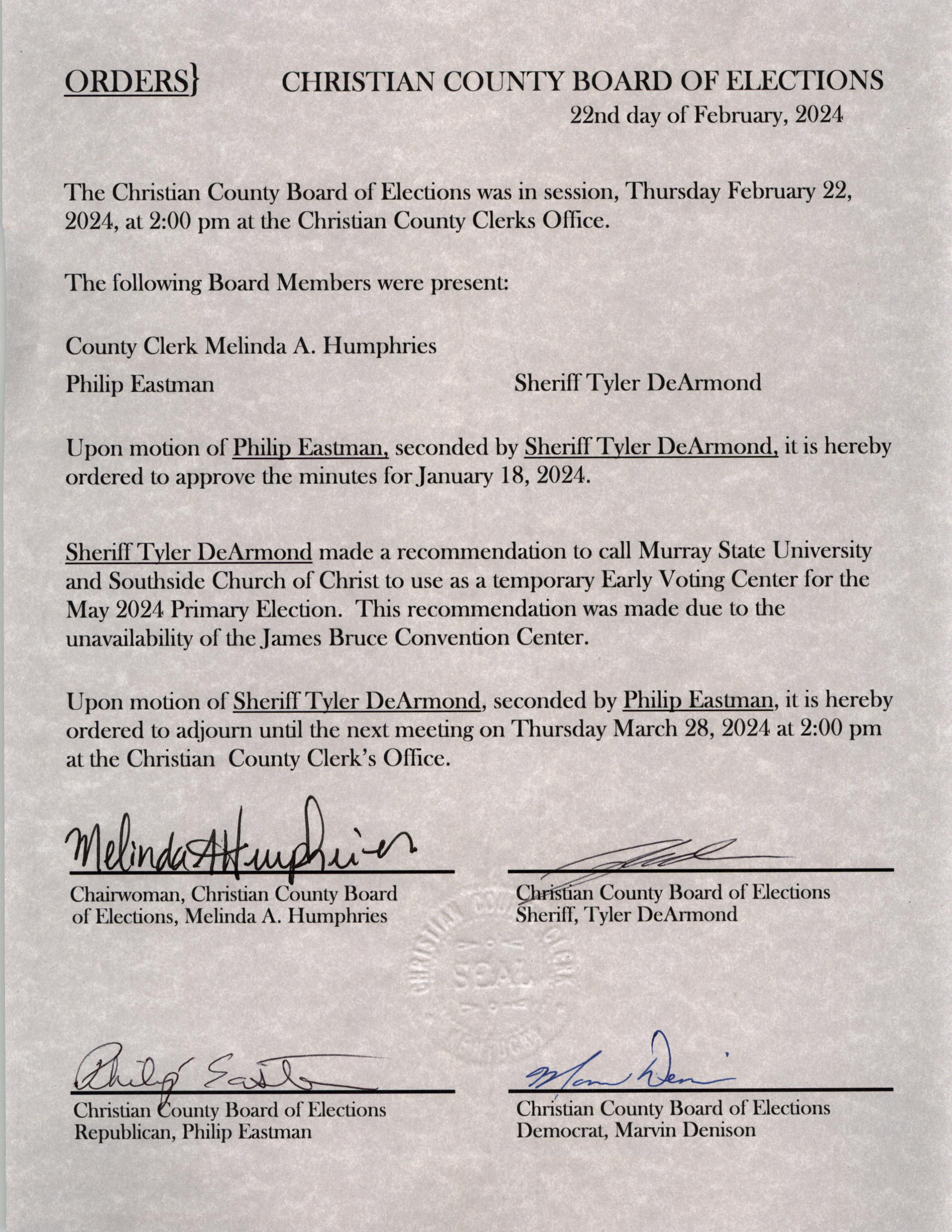 Christian County Board of Elections meets every 3rd Thursday of the month at 2:00 pm. This meeting is held in the Fiscal Courtroom, upstairs in the Christian County Courthouse located at 511 S. Main Street in Hopkinsville.
