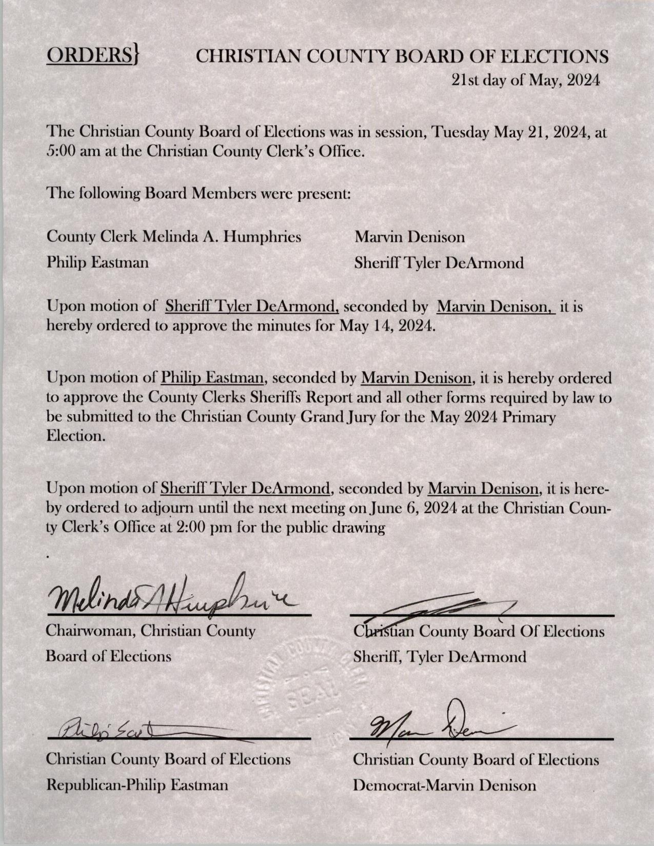 Citizens who wish to address the Board are allowed to do so during the “Citizens Discussion”. Any person or agency wishing to make a presentation to the Board of Elections concerning a specific item, is encouraged to contact the Christian County Clerk's Office, by noon on the Monday preceding the Board meeting so they may be placed on the agenda.